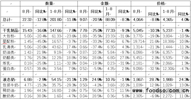 8月中国共进口酸奶类0.16万吨,同比增加38%,进口额0.04亿美元,同比增加28.5%,平均价格为2305美元/吨,同比下降6.9%。